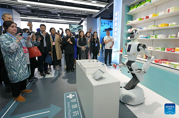 Representatives, who are in Beijing for the Global Leaders' Meeting on Women, watch a robot fetching medicine at the Beijing World of Robots in Beijing, capital of China, Oct. 14, 2025. [Xinhua/Xue Yuge]