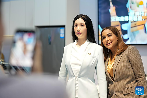 A representative, who is in Beijing for the Global Leaders' Meeting on Women, poses for photos with a humanoid robot at the Beijing World of Robots in Beijing, capital of China, Oct. 14, 2025. [Xinhua/Xue Yuge]