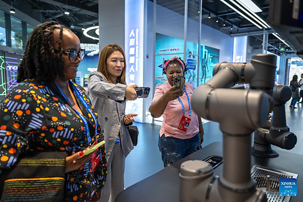 Representatives, who are in Beijing for the Global Leaders' Meeting on Women, watch the demonstration of a robot at the Beijing World of Robots in Beijing, capital of China, Oct. 14, 2025. [Xinhua/Xue Yuge]