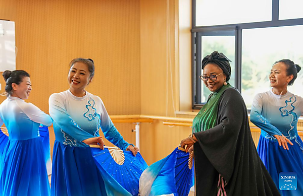 A representative, who is in Beijing for the Global Leaders' Meeting on Women, dances with dancing enthusiasts at a social service center for women and children in Shunyi District in Beijing, capital of China, Oct. 14, 2025. [Xinhua/Yan Linyun]
