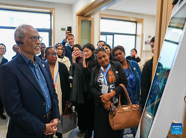 Representatives, who are in Beijing for the Global Leaders' Meeting on Women, learn about an AI-powered psychological counseling device at a social service center for women and children in Shunyi District in Beijing, capital of China, Oct. 14, 2025. [Xinhua/Yan Linyun]