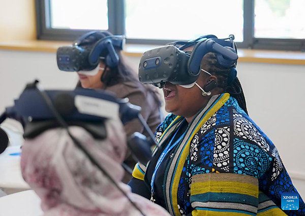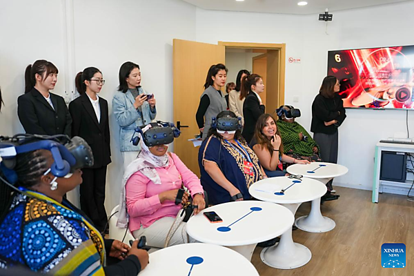 Representatives, who are in Beijing for the Global Leaders' Meeting on Women, try VR devices at a social service center for women and children in Shunyi District in Beijing, capital of China, Oct. 14, 2025. [Xinhua/Yan Linyun]