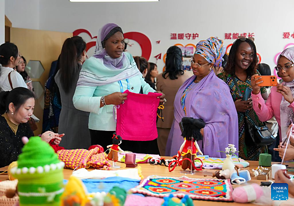 A representative, who is in Beijing for the Global Leaders' Meeting on Women, experiences handicrafts listed as intangible cultural heritage at a social service center for women and children in Shunyi District in Beijing, capital of China, Oct. 14, 2025. [Xinhua/Yan Linyun]