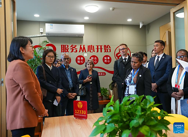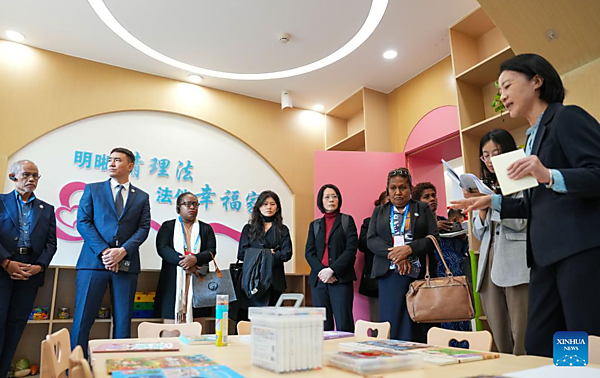 Representatives, who are in Beijing for the Global Leaders' Meeting on Women, visit a rights-safeguarding service center at a social service center for women and children in Shunyi District in Beijing, capital of China, Oct. 14, 2025. [Xinhua/Yan Linyun]