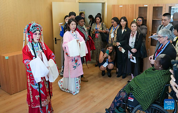 Representatives, who are in Beijing for the Global Leaders' Meeting on Women, watch a Peking Opera performance at a social service center for women and children in Shunyi District in Beijing, capital of China, Oct. 14, 2025. [Xinhua/Yan Linyun]