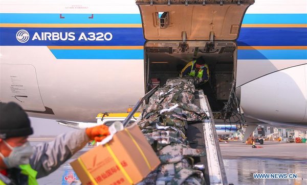 Staff members load baggages of medical team members to an airplane at Shenyang Taoxian International Airport in Shenyang, capital of northeast China's Liaoning Province, February 9, 2020. Medical teams from across China have been rushing to Hubei Province to aid the novel coronavirus control efforts there. [Xinhua/Long Lei]