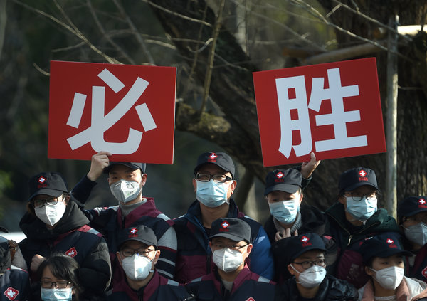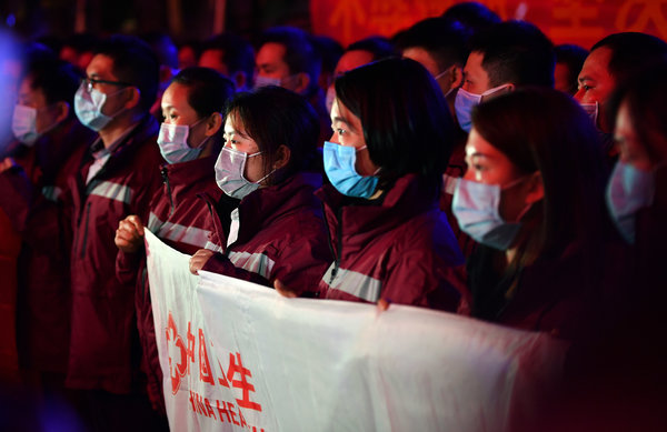 Members of a medical team attend a ceremony before leaving for Hubei Province in Haikou, south China's Hainan Province, Feb. 3, 2020. [Xinhua/Guo Cheng]