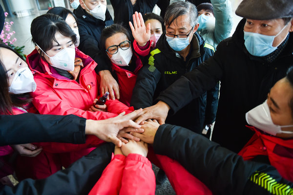 Members of the fourth medical team of Shanxi and their colleagues cheer for each other before leaving for Hubei Province at Wusu International Airport in Taiyuan, capital of north China's Shanxi Province, Feb. 9, 2020. [Xinhua/Chai Ting]