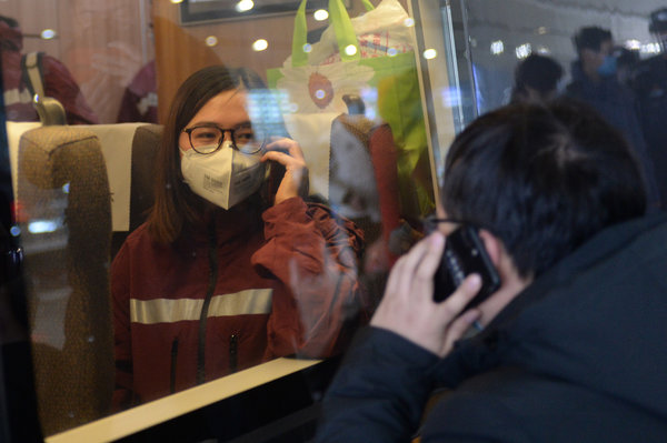 A medical team member (L) of the Second Xiangya Hospital of Central South University says goodbye to her family member via mobile phone at Changsha South Railway Station in Changsha, central China's Hunan Province, Feb. 8, 2020. [Xinhua/Chen Zhenhai]