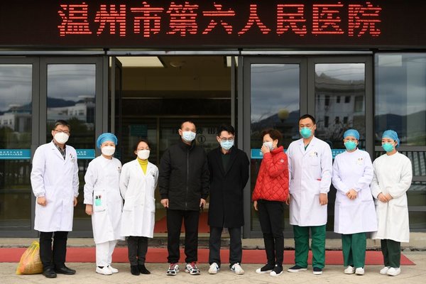 Three cured patients pose for a group photo with medical workers in front of No. 6 People's Hospital of Wenzhou Central Hospital Medical Group in Wenzhou, east China's Zhejiang Province, Feb. 7, 2020. [Xinhua/Weng Xinyang]
