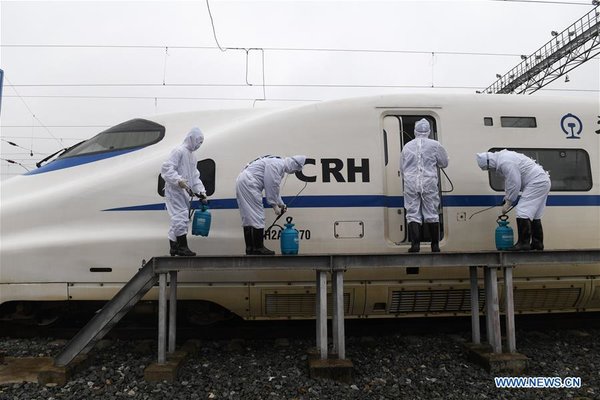 Staff members of China Railway Nanning Group Co., Ltd. conduct disinfection work for a train in Nanning, south China's Guangxi Zhuang Autonomous Region, February 6, 2020. China Railway Nanning Group Co., Ltd. conducts disinfection operations every day on the trains to help prevent and control the spread of the novel coronavirus. [Xinhua/Lu Boan]