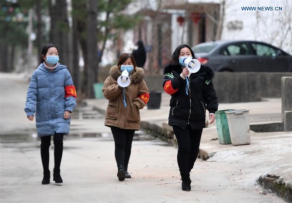 Staff give information on the prevention and control of the novel coronavirus in Hantang Village in Nanchang County, east China's Jiangxi Province, February 3, 2020. Various measures are taken across China to combat the novel coronavirus. [Xinhua/Wan Xiang]