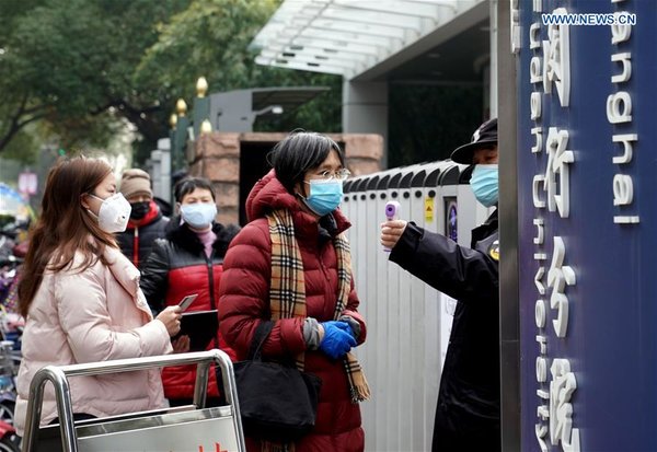 Staff measures the body temperature at the entrance of a hospital in Shanghai, east China, February 3, 2020. Various measures are taken across China to combat the novel coronavirus. [Xinhua/Liu Ying]