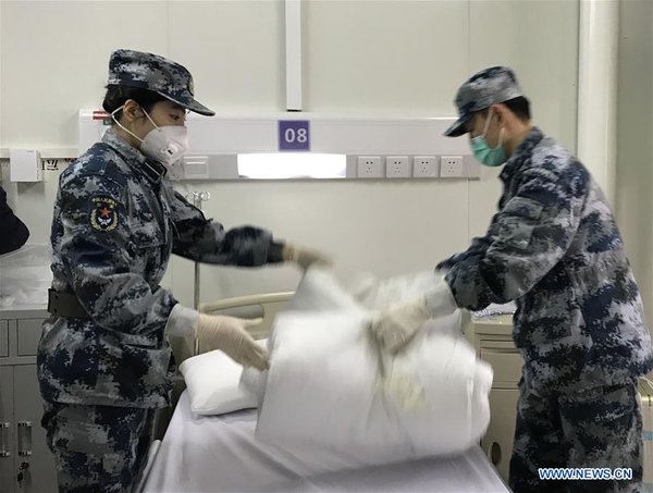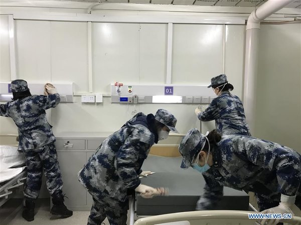 Medical staff test facilities and make the bed at Huoshenshan (Fire God Mountain) Hospital to make final preparations to admit patients infected with the novel coronavirus in Wuhan, central China's Hubei Province, February 3, 2020. [Xinhua]