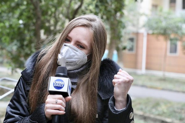 Vera Syrvasova, a Russian student studying at Huazhong University of Science and Technology shouts "Wuhan, Jiayou (stay strong)" in Wuhan, Central China's Hubei Province, on Feb 1, 2020. [China Daily/Zhu Xingxin]