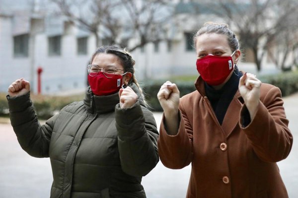 International students at Wuhan University, Elvira Zhaidarova from Kazakhstan and Svetlana Zhigalova from Russia, shout "Wuhan, Jiayou" (roughly translated as, "Stay strong, Wuhan"), in Wuhan, Central China's Hubei Province, on Feb 1, 2020. [China Daily/Zhu Xingxin]