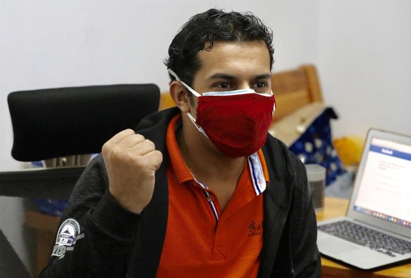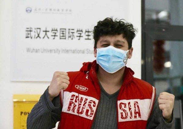 Davlatov Khairiddin, a foreign student studying at Wuhan University, shouts "Wuhan, Jiayou" in Wuhan, Central China's Hubei Province, on Feb 1, 2020. [China Daily/Zhu Xingxin]