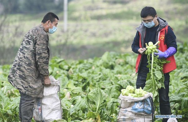 A volunteer (R) harvests stem mustard for villagers at Dengjia Village in Fuling District, southwest China's Chongqing Municipality, February 13, 2020. A volunteer service group has been formed in Fuling District of Chongqing Municipality to help locals in need and those who are in quarantine at home to harvest stem mustard, the raw material for the pickle, amid the fight against novel coronavirus outbreak. [Xinhua/Wang Quanchao]