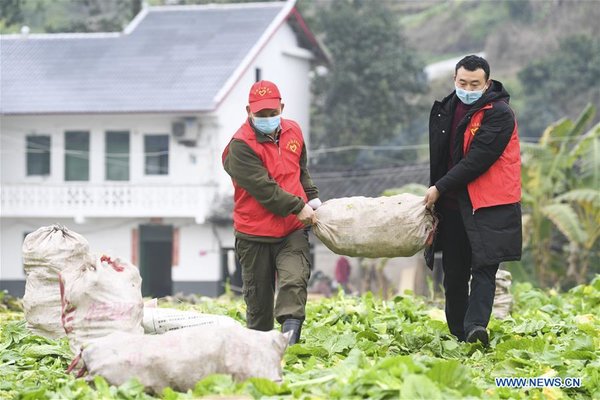 Volunteers deliver freshly harvested stem mustard at Erdu Village in Fuling District, southwest China's Chongqing Municipality, February 13, 2020. A volunteer service group has been formed in Fuling District of Chongqing Municipality to help locals in need and those who are in quarantine at home to harvest stem mustard, the raw material for the pickle, amid the fight against novel coronavirus outbreak. [Xinhua/Wang Quanchao]