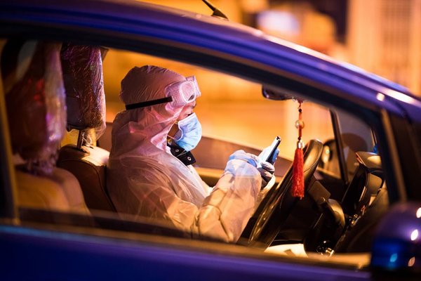 Volunteer Wang Zhen, member of the volunteer group "Wuhan Emergency Team" taking pregnant women without access to vehicles to the hospital, checks information in a car in Wuhan, central China's Hubei Province, February 29, 2020. [Xinhua/Xiao Yijiu]