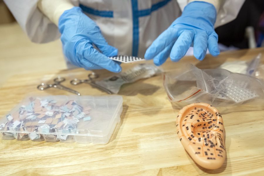 | A nurse prepares to treat a patient with traditional Chinese medicine (TCM) therapies at a temporary hospital in Jiangxia District in Wuhan, central China's Hubei Province, February 25, 2020. [Xinhua] |