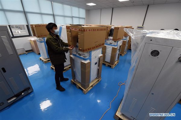 A staff member packs a non-contact self-service machine at the Anhui Easpeed Technology Co. in Hefei, east China's Anhui Province, March 9, 2020. A number of non-contact self-service machines and non-contact elevator buttons have been put into use in many hospitals and office buildings in the city to help reduce the risk of cross-infection in public areas. These devices, taking advantage of a kind of interactive holographic air cast imaging technology, can project elevator buttons and operation interface of self-service machines into the air to enable users to complete operation without touching the real objects. [Xinhua/Zhou Mu]