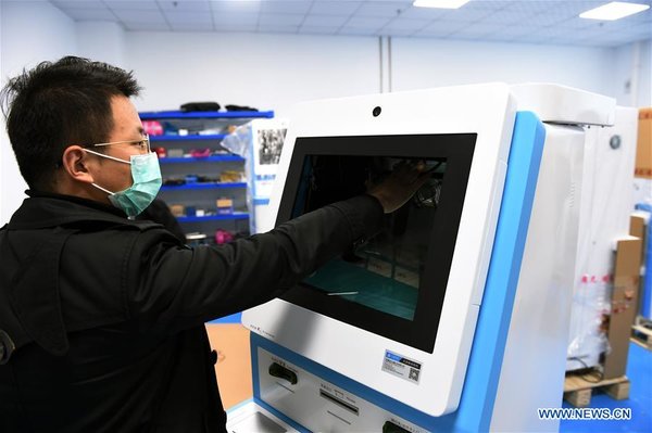 A staff member adjusts a non-contact self-service machine at the Anhui Easpeed Technology Co. in Hefei, east China's Anhui Province, March 9, 2020. A number of non-contact self-service machines and non-contact elevator buttons have been put into use in many hospitals and office buildings in the city to help reduce the risk of cross-infection in public areas. These devices, taking advantage of a kind of interactive holographic air cast imaging technology, can project elevator buttons and operation interface of self-service machines into the air to enable users to complete operation without touching the real objects. [Xinhua/Zhou Mu]
