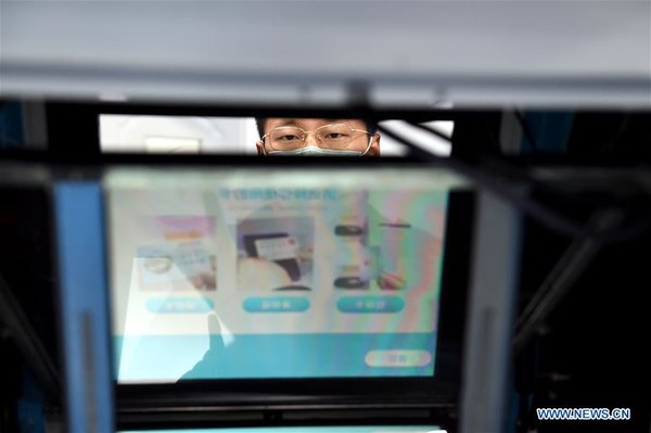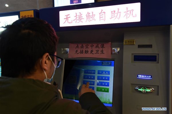 A patient uses a non-contact self-service machine at the First Affiliated Hospital of University of Science and Technology of China in Hefei, east China's Anhui Province, March 9, 2020. A number of non-contact self-service machines and non-contact elevator buttons have been put into use in many hospitals and office buildings in the city to help reduce the risk of cross-infection in public areas. These devices, taking advantage of a kind of interactive holographic air cast imaging technology, can project elevator buttons and operation interface of self-service machines into the air to enable users to complete operation without touching the real objects. [Xinhua/Zhou Mu]