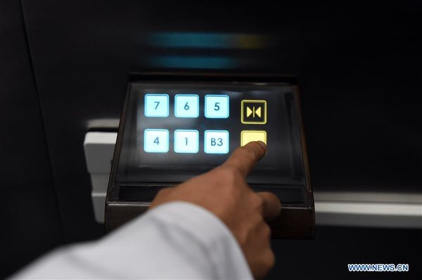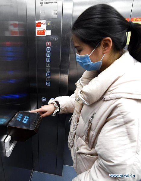 A person uses non-contact buttons to operate an elevator at the First Affiliated Hospital of University of Science and Technology of China in Hefei, east China's Anhui Province, March 9, 2020. A number of non-contact self-service machines and non-contact elevator buttons have been put into use in many hospitals and office buildings in the city to help reduce the risk of cross-infection in public areas. These devices, taking advantage of a kind of interactive holographic air cast imaging technology, can project elevator buttons and operation interface of self-service machines into the air to enable users to complete operation without touching the real objects. [Xinhua/Zhou Mu]