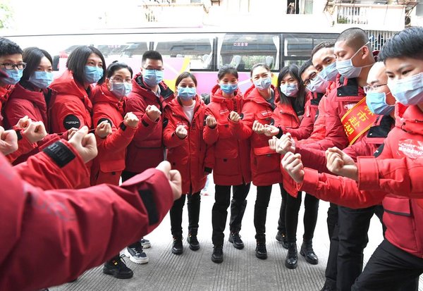 | Medical team members encourage each other before leaving for Wuhan in Nanning, south China's Guangxi Zhuang Autonomous Region, Feb. 21, 2020. [Xinhua/Zhou Hua] |