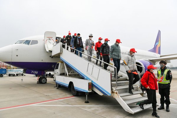 | Migrant workers from Xinjiang Uygur Autonomous Region get off a chartered airplane at Sunan Shuofang International Airport in Wuxi, east China's Jiangsu Province, Feb. 26, 2020. [Xinhua/Li Bo] |