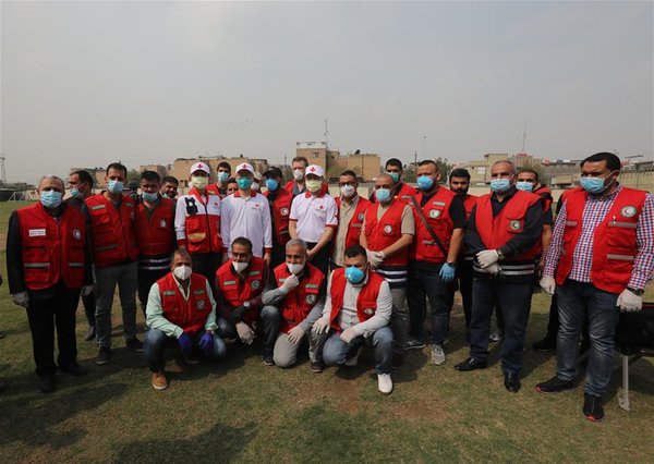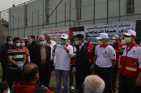 Iraqi Red Crescent Society members pose for a group photo with Chinese experts at a community center in Baghdad, Iraq, on March 16, 2020. A Chinese team of seven health experts is providing guidance and medical assistance to contain the COVID-19 outbreak in Iraq. The experts are helping Iraqi health authorities prioritize response strategies, fill testing gaps and bring China's experience to benefit the worn-torn country. The Chinese expert team arrived in Baghdad on March 7 and is expected to stay in the country for one month. [Xinhua]