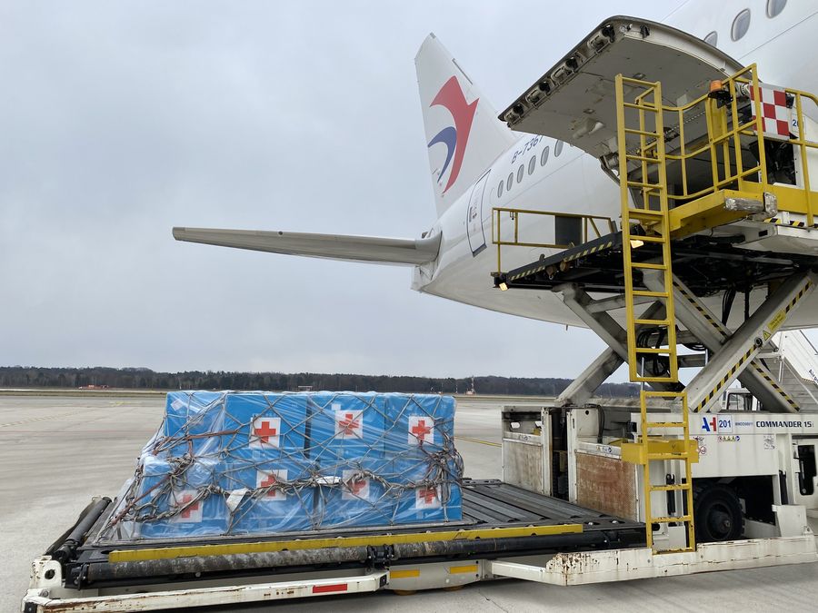 | Medical supplies coming along with the third Chinese medical team are unloaded from the plane at Milan Malpensa Airport in Milan, Italy, March 25, 2020. [Xinhua] |