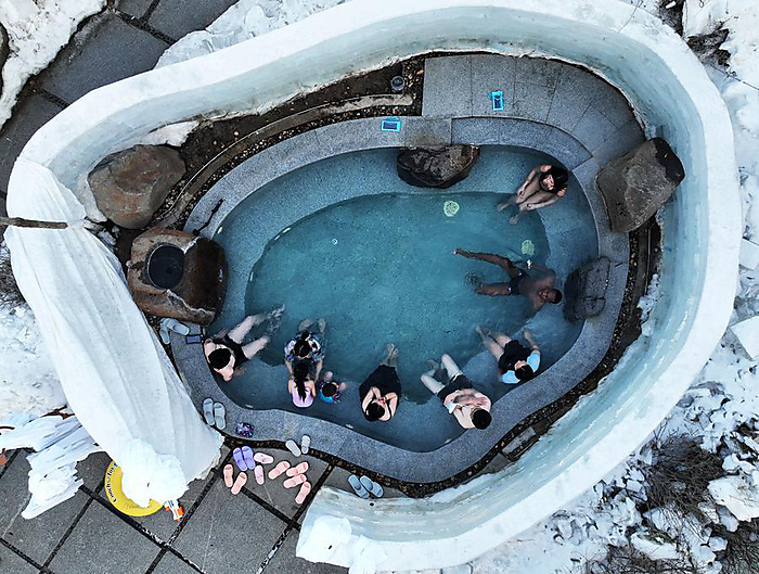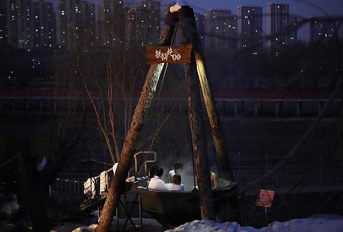 | Visitors enjoy a hot bath in a giant iron pot at a hot spring resort in Shenyang, northeast China's Liaoning Province, Jan. 17, 2025. [Xinhua/Li Gang] |