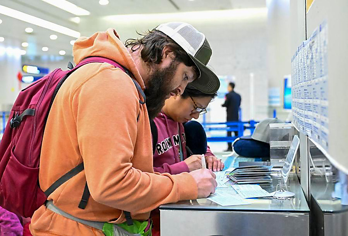 | Tourists fill in entry information at Shanghai Pudong International Airport in Shanghai, east China, on Feb. 11, 2026. [Xinhua/Chen Haoming] |