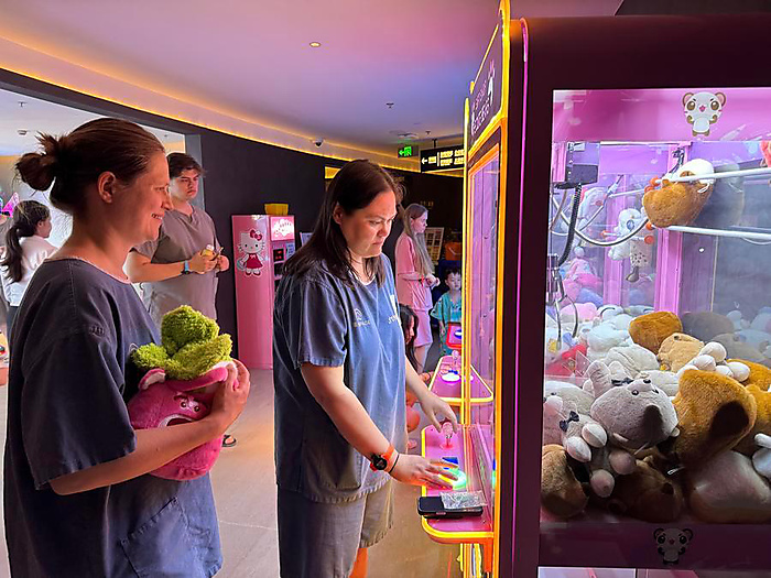 | Foreign tourists play with a claw machine at a hot spring resort in Shanghai, east China, April 3, 2026. [Xinhua/Huang Anqi] |
