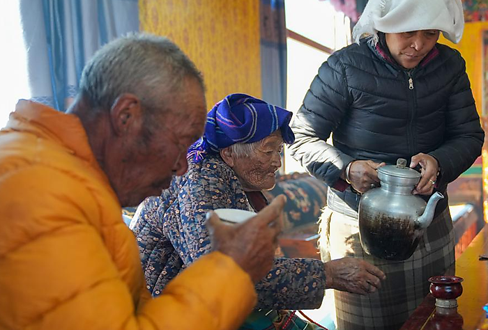 | Konjo Chodron (C) drinks tea with her family at home in Nyemo County, Lhasa City, southwest China's Xizang Autonomous Region, March 6, 2026. [Xinhua/Jigme Dorje] |
