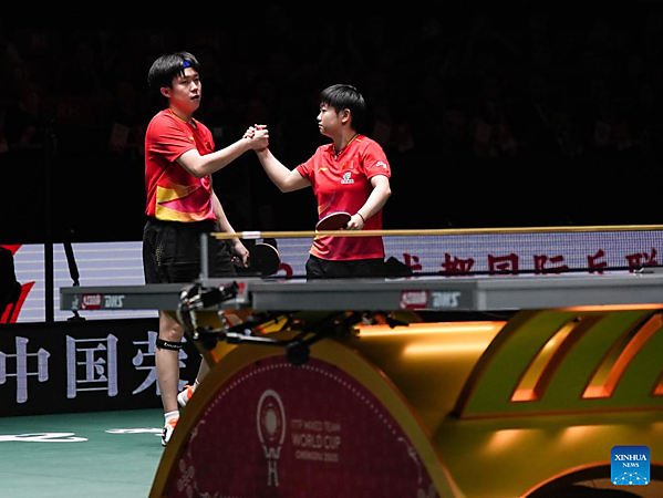 | Wang Chuqin/Sun Yingsha (R) of China celebrate in the mixed doubles match against Matsushima Sora/Odo Satsuki of Japan during the final match between China and Japan at the ITTF Mixed Team World Cup 2025 in Chengdu, southwest China's Sichuan Province, Dec. 7, 2025. [Xinhua/Wang Xi] |