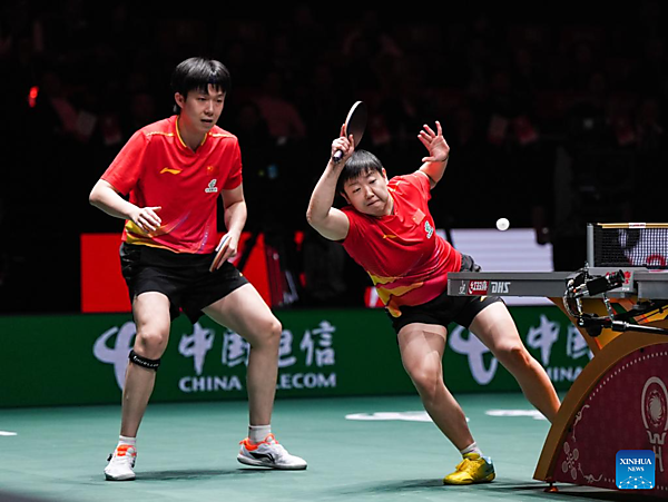 | Wang Chuqin (L)/Sun Yingsha of China compete in the mixed doubles match against Matsushima Sora/Odo Satsuki of Japan during the final match between China and Japan at the ITTF Mixed Team World Cup 2025 in Chengdu, southwest China's Sichuan Province, Dec. 7, 2025. [Xinhua/Wang Xi] |