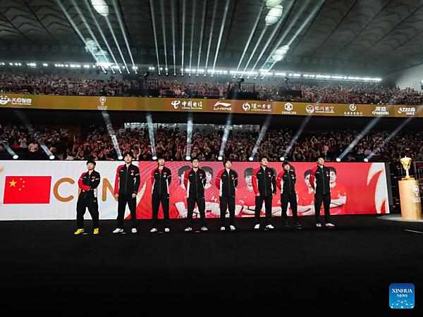 | Team members of China are seen before the final match between China and Japan at the ITTF Mixed Team World Cup 2025 in Chengdu, southwest China's Sichuan Province, Dec. 7, 2025. [Xinhua/Wang Xi] |