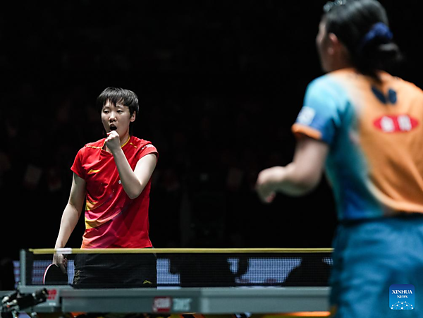 | Wang Manyu (L) of China reacts in the women's singles match against Harimoto Miwa of Japan during the final match between China and Japan at the ITTF Mixed Team World Cup 2025 in Chengdu, southwest China's Sichuan Province, Dec. 7, 2025. [Xinhua/Wang Xi] |