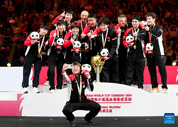 | Gold medalists team China pose for a selfie during the awarding ceremony at the ITTF Mixed Team World Cup 2025 in Chengdu, southwest China's Sichuan Province, Dec. 7, 2025. [Xinhua/Wang Ying] |