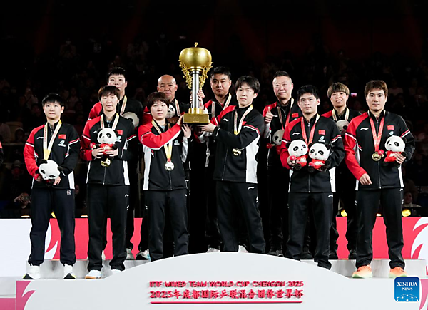| Gold medalists team China pose during the awarding ceremony at the ITTF Mixed Team World Cup 2025 in Chengdu, southwest China's Sichuan Province, Dec. 7, 2025. [Xinhua/Wang Ying] |
