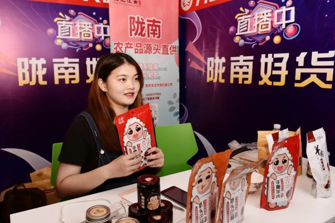 | A college student promotes agricultural products of Longnan City, Northwest China's Gansu Province, during the women's livestreaming event in Yiwu City, East China's Zhejiang Province, on August 18. [Yiwu Women's Federation] |