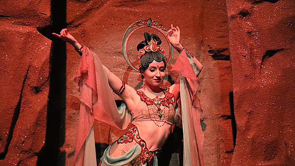 This undated photo shows Romanovych Inna performing the dance drama "Ancient Sound of Dunhuang" in Dunhuang, northwest China's Gansu Province. [Gansu Performance Group/Handout via Xinhua] |