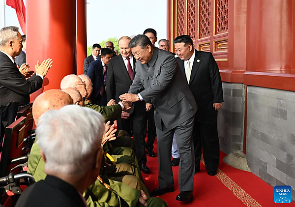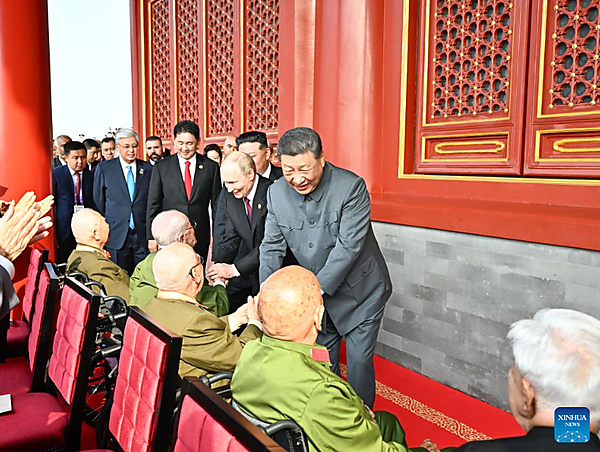 BEIJING, Sept. 3 (Xinhua) — Chinese President Xi Jinping ascended Tian'anmen Rostrum and shook hands with war veterans attending V-Day commemorations.