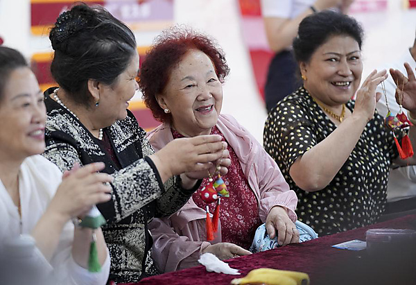 Residents make sachets during a celebration of the Dragon Boat Festival at Guyuanxiang Community in Urumqi, northwest China's Xinjiang Uygur Autonomous Region, June 6, 2024. [Xinhua/Wang Fei] |