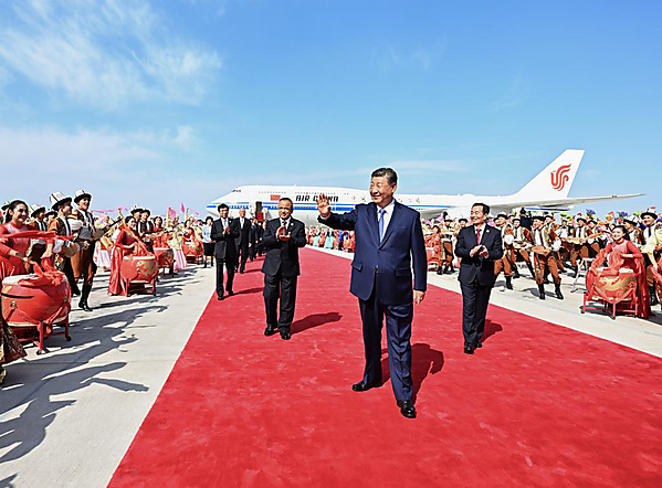 As he descended from the ramp, Xi received flowers from children and was welcomed by songs and dances performed by people of various ethnic groups.