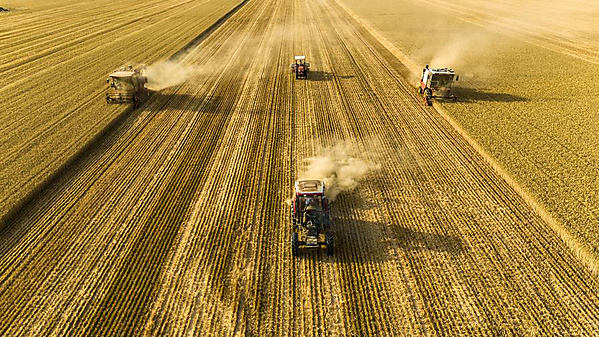 A drone photo shows harvesters reaping wheat in the fields in Pantang Village of Lizhuang Town, Shangqiu City, central China's Henan Province, June 4, 2025. [Photo by Li Heng/Xinhua] |