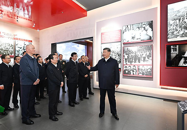 Chinese President Xi Jinping, also general secretary of the Communist Party of China Central Committee and chairman of the Central Military Commission, visits a themed exhibition in celebration of the 70th founding anniversary of the Xinjiang Uygur Autonomous Region at a cultural center in Urumqi, the regional capital, Sept. 24, 2025. [Xinhua/Xie Huanchi] |